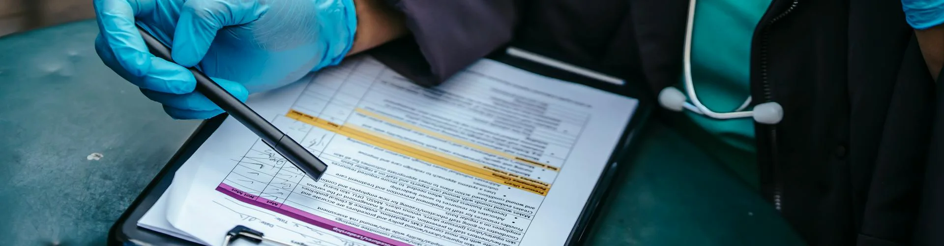 - Paper medical charts, encounter forms, and progress notes with patient names, dates of birth, and clinical details